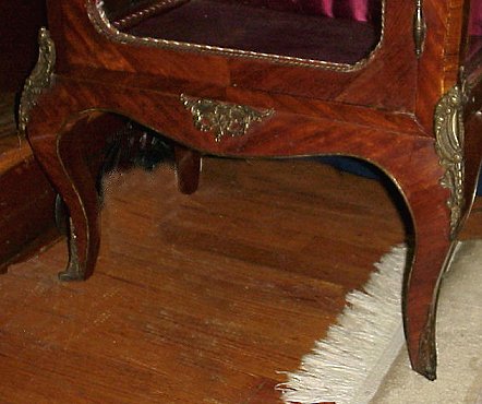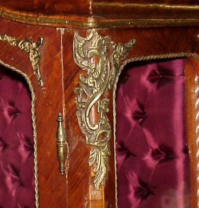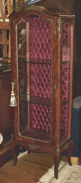 ORMOLU FRENCH VITRINE CURIO: A diminutive decorative arched top curio with satin tufted back, interior of two glass shelves. Please note make shift shelf supports. 63 1/2''h, x 23 1/2'' x 12 1/4''.