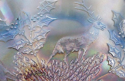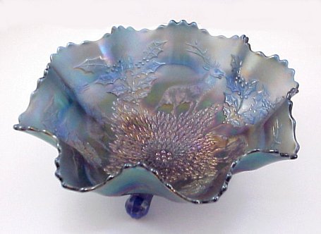 FENTON BLUE CARNIVAL GLASS ''STAG AND HOLLY'' FOOTED BOWL: A hard to find early Fenton pattern. The holly has 24 berries, the tongue on the deer is elongated. Scrolled ball feet. 10 1/2'' dia.