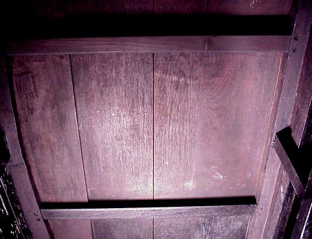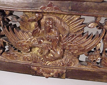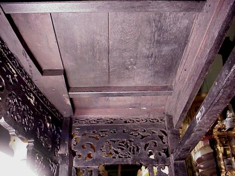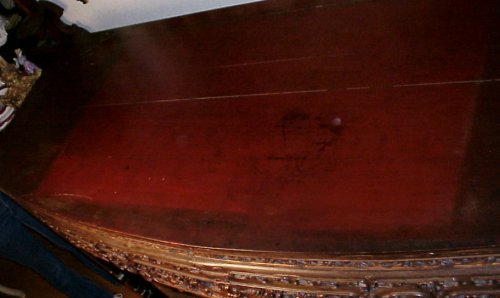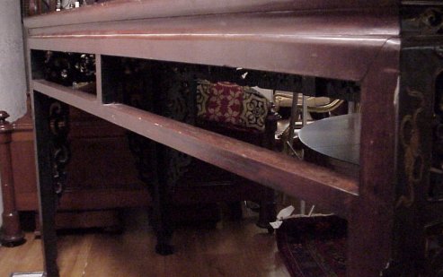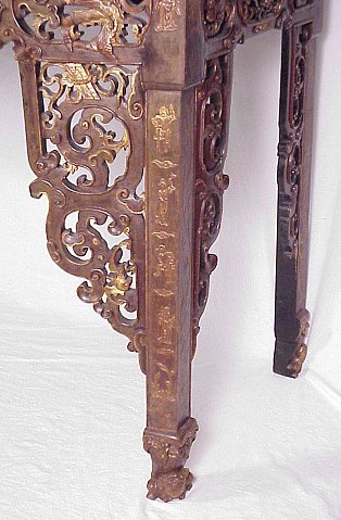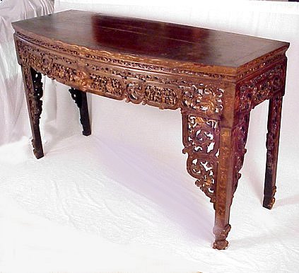 CHINESE ALTAR TABLE: Pierced carved apron and leg brackets, gilt enhancement, bowed front. 48 1/2'' H, 7' L, 31 1/2''Deep.