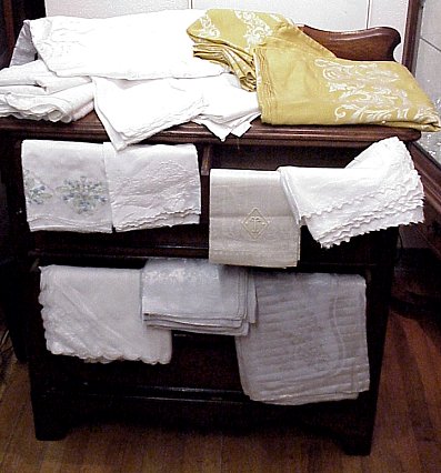 ESTATE FINE LINENS: Fine assortment of beautiful sets, hand embroidered and crochet napkins, table clothes, pillow cases and hand towels. 1 linen tablecloth 64'' x 101'', 1 grey tablecloth 12 square napkins (not antique), 1 gold tablecloth , 12 square napkins (not antique), 1 linen tablecloth 64'' x 105 with cutwork embroidering, 3 linen hand towels with initial T, 12 napkins and 64'' x 106'' cloth, 17 linen napkins, 12 linen napkins, 12 linen napkins, 1 pillowcase (all white), 2 pillow cases embroidered with blue and violet colored flowers.