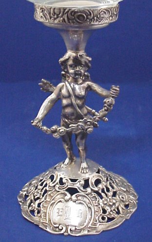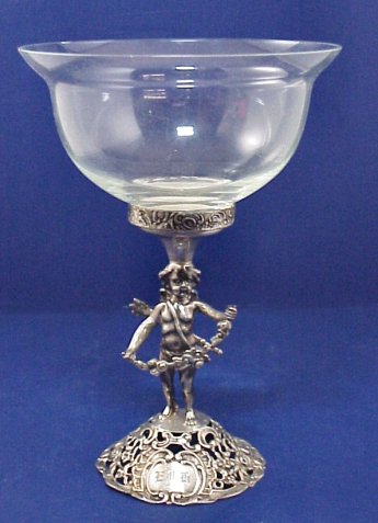 CHERUB STERLING FIGURAL COMPOTE: Sterling reticulated domed base and cherub stem support crystal bowl. Marked ''Sterling''. 6 1/8'' dia., 9''h.