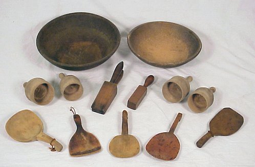 COLLECTION OF EARLY BUTTER MOLDS, BOWLS, AND PADDLES: Starting with the two bowls, one 12 1/2'', the other 14'' dia. Then there is an assortment of 5 paddles. Next comes the four presses, one sheep, one swan and two rooster designs. All with wooden handles.
