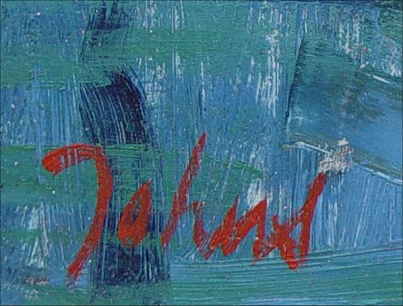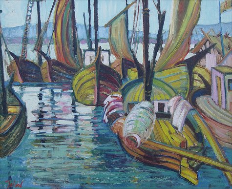 COLORFUL MODERNIST STYLE DOCK SIDE SCENE WITH BOATS: O/B, 20'' x 24'', SLL Jahns?, possibly Maximillian Jahns. Needs Cleaning.