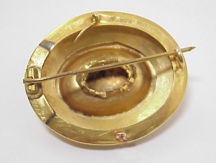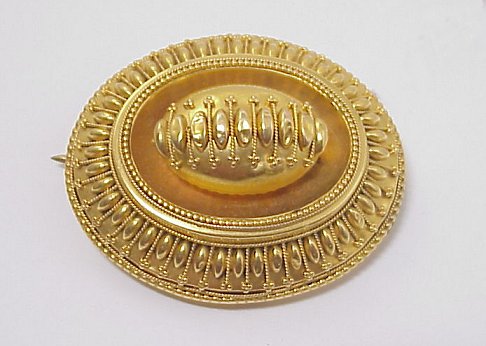 VICTORIAN BROOCH IN AN ETRUSCAN STYLE: Oval domed brooch of bright yellow, centered by conforming oval ball, applied bead and twisted wire decoration, please note small section of missing wire and some bead denting, with hidden charm hook and pendant? loop, 1 5/8'' x 1 3/8'', assayed 14k.