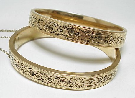 PAIR OF VICTORIAN ENAMELED BANGLE BRACELETS: Lovely yellow gold hinged bangles decorated with black enamel in a floral and foliate design, assays 14k probably rolled, pressure clasp marked *38, safety chains, inner bracelet measurement 2 1/4'' x 1 3/4'', fits approx. 6'' wrist.