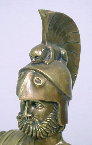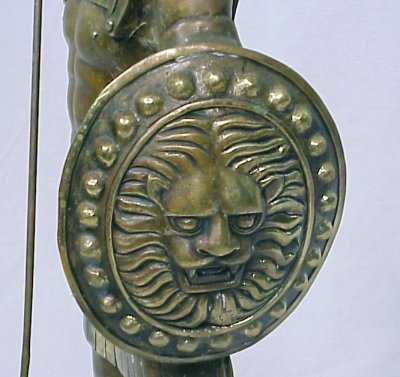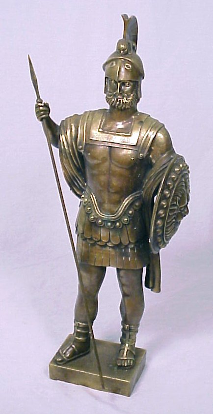 BARE CHESTED SPARTAN SOLDIER: This figure is representation of a great Roman era soldier in period garb. He is donning head dress, shield and spear. 26'' h, actual age unknown. Est. $0/0**