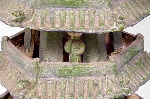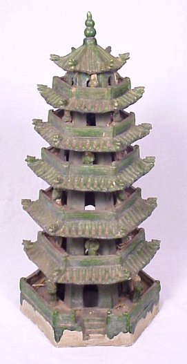 ORIENTAL WATCH TOWER: Green glazed sextagonal watch tower which has dragon like animal heads protruding from the roof corners. This six storied structure has oriental figures watching from all floors. 31'' h, actual age unknown. Est. $0/0**