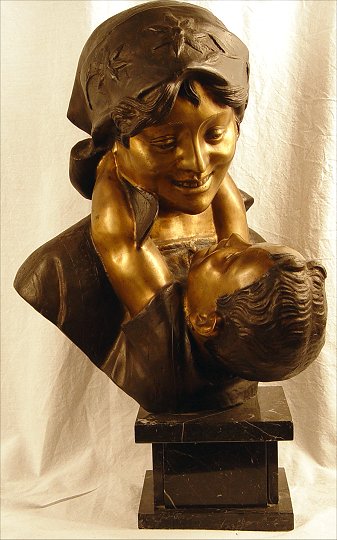 20TH CENTURY PATINATED BRONZE GROUPING OF A MOTHER AND CHILD: Bronze affixed to a polished marble pedestal with minor chip in base. 21'' h, base signed verso ''Merenda'', most likely a decorative recast, but still of considerable quality.