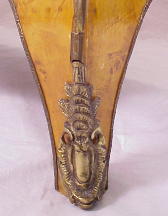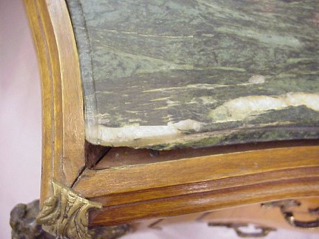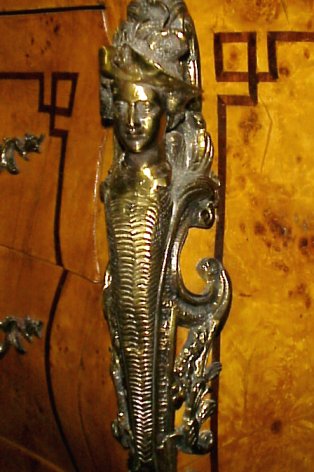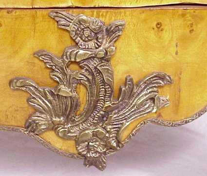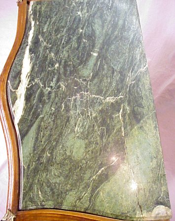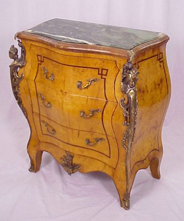 FRENCH REGENCY STYLE BOMBE COMMODE: Constructed of beautiful thuya burl and having geometric banded inlay to sides and drawer fronts. Figural ormolu, human masquerons to each quarter column, thick green variegated top. 37'' h, 32'' w, 19'' d.