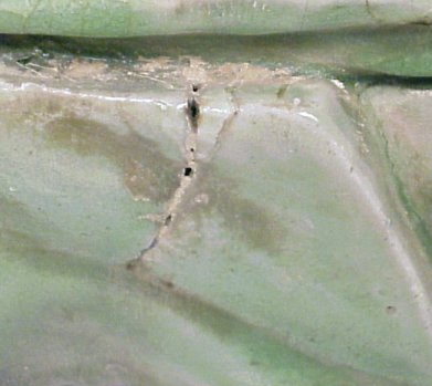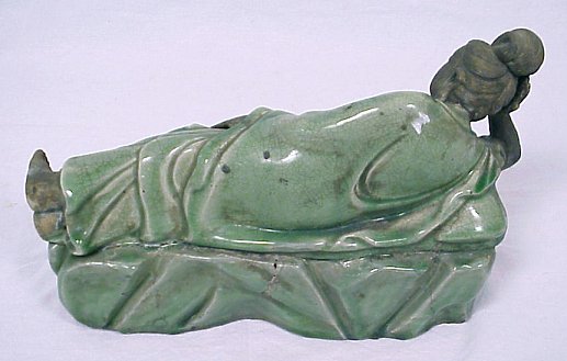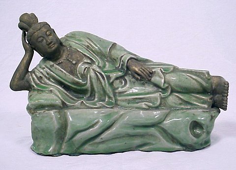 GLAZED DEITY FIGURINE: Heavy pottery rendition of a reclining Quan Yin. Green glaze covers her dress and bed, while her skin has a bronzed patina. 16'' l, 10'' h, actual age unknown. Est. $0/200**