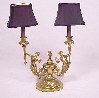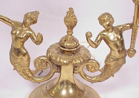 HIGHLY DECORATIVE FIGURAL BRASS LAMP: Heavy brass lamp topped by custom black shades. 18 1/4''h. x 12''w.