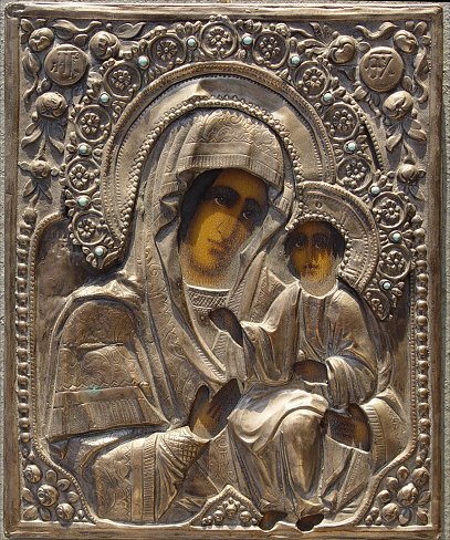 RUSSIAN? ICON ENCASED IN A SILVER? SHROUD: Depicts the Madonna and child, embossed and jeweled encasement, has no visible hallmarks, probably early to mid 20th century, 10 3/4'' x 8 1/4''.