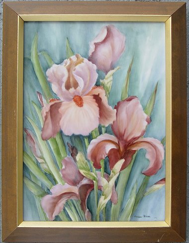 WIEBE, Helen, (American, 20th C): ''Irises'', Painting on Porcelain, 13'' x 9 1/4'', signed lower right, label affixed verso with artist and title.