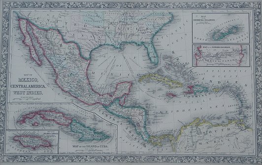 MAP OF MEXICO, CENTRAL AMERICA AND THE WEST INDIES: Constructed and engraved by W. Williams of Philadelphia, dated 1860, hand colored, sight size 13 1/4 '' x 21 1/4''. Quite possibly a 20th century reprint, but there is a probability that this is a period map dating to 1860.