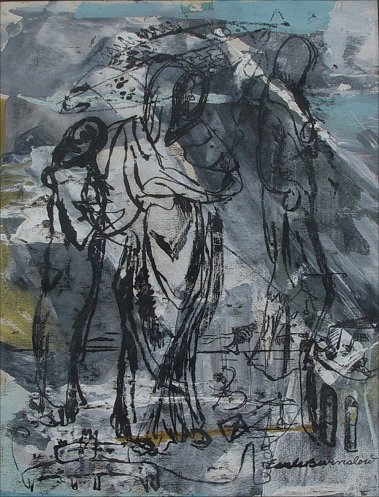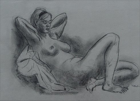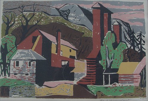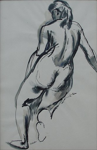 WINSLOW, Earl Bartrum, (American, 1884-1969): Four piece collection of art works. First piece is a reclining nude study, Charcoal, 11 1/2'' x 15 1/4'', monogrammed lower right. Second piece is a rear nude study, Ink and Gouache, 17'' x 11 1/2'', monogrammed to lower right. Third piece is a rural landscape with farm buildings, Serigraph, sight size 6 1/2'' x 9 1/2'', pencil signed lower right and numbered 27. Fourth piece is an abstract figural study, Mixed media, 11 1/2'' x 9'', signed lower right.