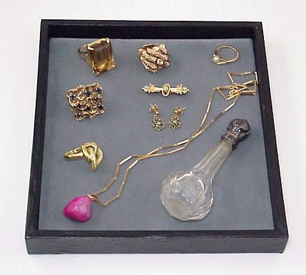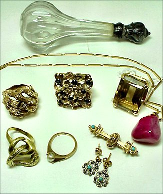 LOT OF ESTATE GOLD JEWELRY: To include, two 18k rings - one with sapphires, three 14k rings - one with giant topaz, bar pin, 22'' Italian 14k bar link necklace, floral repousse silver? top perfume. Sold as a lot.
