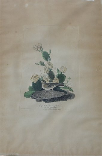 GRAFS, FINCH OR BAY-WINGED BUNTING: Engraving after Audubon by R. Havell, sight size 36 1/2 x 24 1/2'', period 19th Century engraving. Condition - Staining throughout with fading to the color, minor spots of foxing, there is some rippling to the edges, probably mounted with glue. Worn gilded frame.