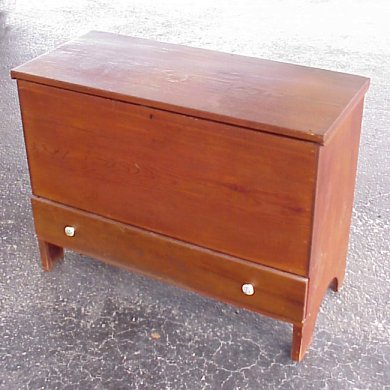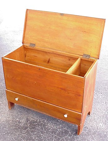 PINE BLANKET CHEST WITH DRAWER: Lift top chest over full length drawer. Replaced drawer pulls. 33 1/2''h. x 44 1/2'' x 9 1/4''.