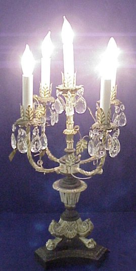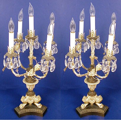 PAIR OF FIVE-LIGHT CANDELABRA LAMPS: Paint and gilt finish. Each of the bobeches have faceted teardrop crystal prisms. 23'' h, base is 8'' dia.