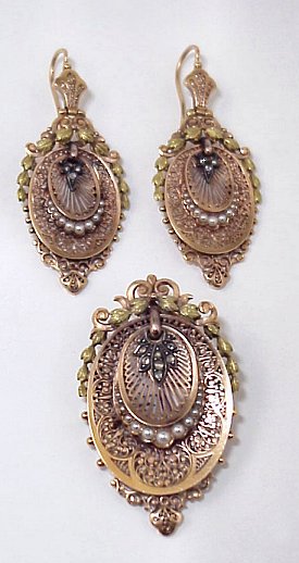 FRENCH VICTORIAN 18K FILIGREE BROOCH & EARRINGS: Lovely delicate filigree ovals, topped by scroll and bell flower design, center medallion edged by graduated seed pearls and leaves set with tiny mine cut diamonds. Brooch with pendant bar attachment, 2 1/8'' x 1 1/4'', replacement stick pin, C clasp hinged for folding. Dangle earrings with shepherd hook findings, 2 1/4''l. overall, French hawk head mark to hooks. Approx. 29 grams overall. Est. $1500/2000**