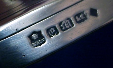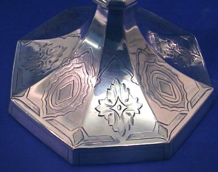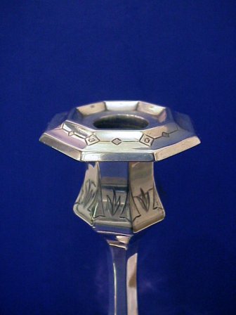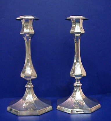 PAIR OF ENGLISH PLATE CANDLE HOLDERS: Statuesque sticks with embossed design. Bears the hallmark of Elkington Silver Co. 10 1/2''h. Octagonal base is 5 1/8'' dia.