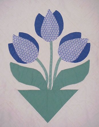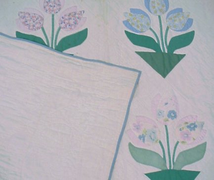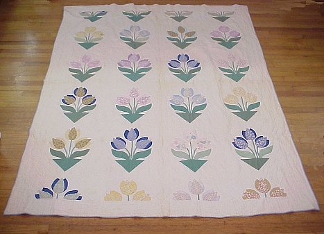 HAND SEWN TULIP APPLIQUE QUILT: Hand quilted, no rips or tears. Minor discoloration. Approx. 89'' x 68''.