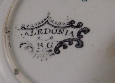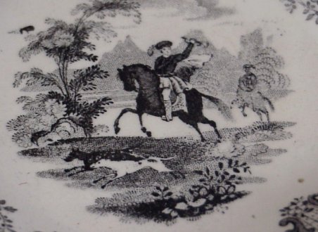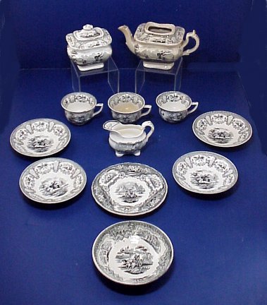 STAFFORDSHIRE BLACK TRANSFER CHILD'S TEA SET: ''CALEDONIA'' by Wm. Adams, Ca. 1821-1840. Set includes teapot (minus lid), covered sugar, 3 cups, 4 saucers. Sold with child's gravy and 2 plates in unidentified pattern.