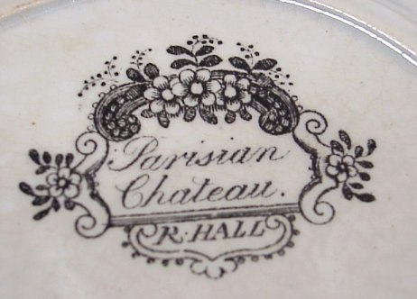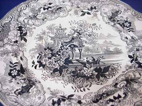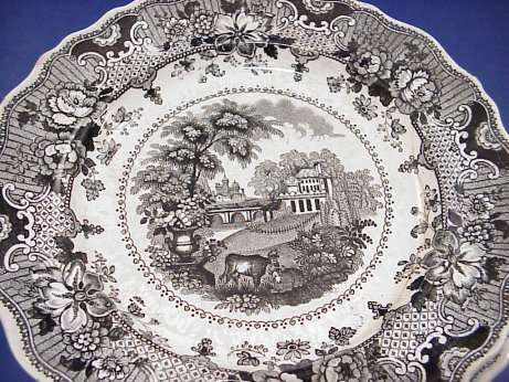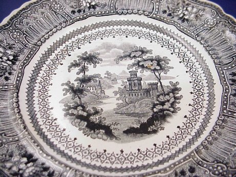 6 STAFFORDSHIRE BLACK TRANSFER PLATES: 19th C. plates approx. 7'' dia. Patterns include Sicilian, there are three Cologne, and two Parisian Chateau (cracks).
