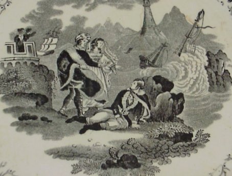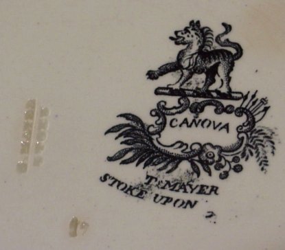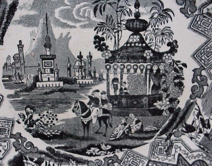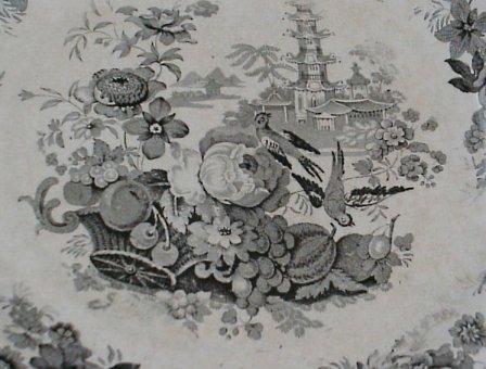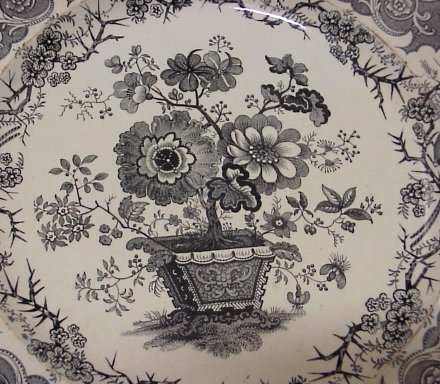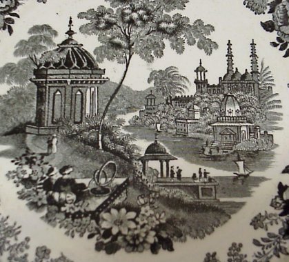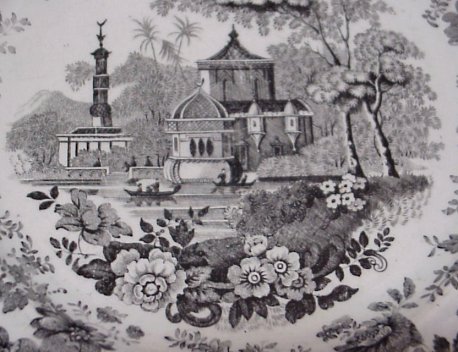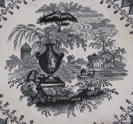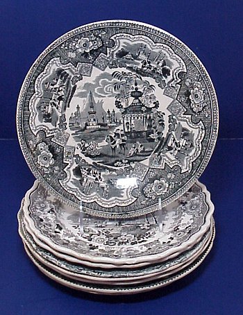 8 STAFFORDSHIRE BLACK TRANSFER PLATES: 19th C. plates approx. 9'' dia. Patterns are Damascus, The Sea, Pagoda, Japanese, Canova, and three in the Asiatic Scenery pattern.