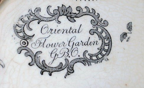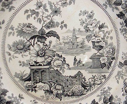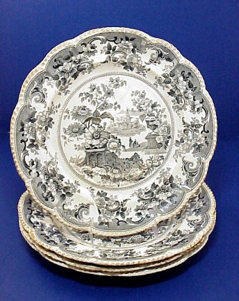 4 STAFFORDSHIRE BLACK TRANSFER PLATES: Set of 19th C. plates in the Oriental Flower Garden pattern, approx. 10'' dia. Please note darkened rims on each.