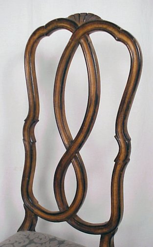 SET OF 6 COUNTRY FRENCH DINING CHAIRS: Tall, ribbon back chairs, recent seat upholstery and fringe. 20th C. 46''h, 19''w.