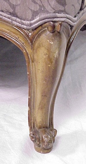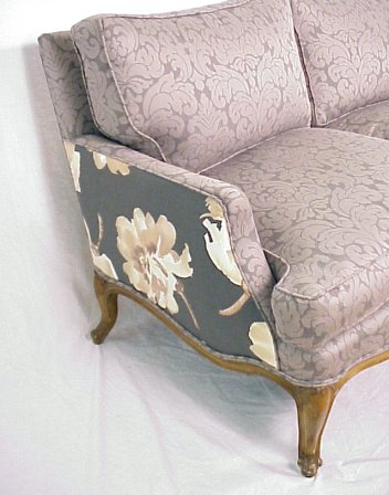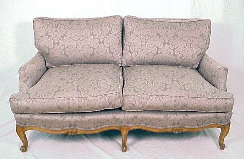 1930'S COUNTRY FRENCH LOVESEAT: Recently upholstered in a cotton damask. 2 cushions. 5'l, 31''h.