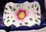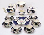 GAUDY WELSH ''FLORET'' DESSERT SET: 10 piece set to include teapot, 8''h., cream pitcher, 5''h., covered sugar (crack in finial), 6 3/4'', cake plate, 10''dia., waste bowl, and six cups and saucers.