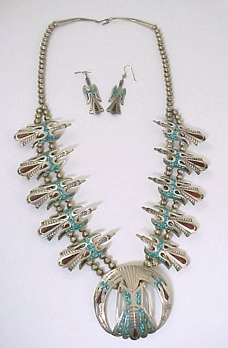 NATIVE AMERICAN SQUASH BLOSSOM ENSEMBLE: Elaborate naja on double strand of silver beads with 5 thunderbirds to each side, all inset with turquoise and coral? mosaic, 29''l., with matching dangle earrings, 2 1/2'', silver content unknown on beads and birds, earring hooks marked 925.