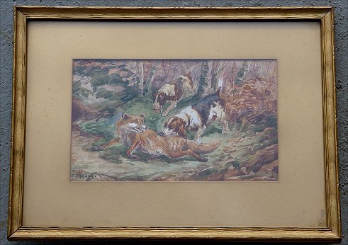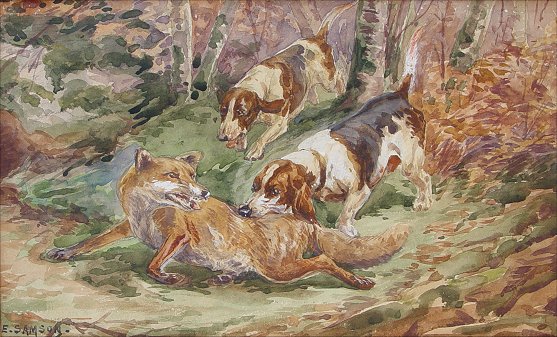 SAMSON, E., (European, 19th/20th C): Hounds attacking Fox, W/C, 5 1/4'' x 8 1/2'', signed lower left.