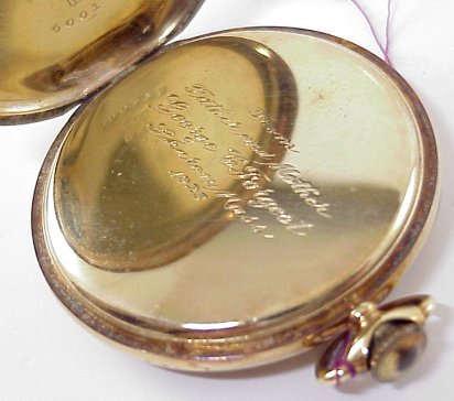 LONGINES 14K GOLD POCKET WATCH: 44mm, works 5 adjust, 17 jewels, #3769584, 14k yellow gold open face case, #500175 17/79, dedicated ''From Father and Mother George C. Forgeot Sharon, Mass 1923'' inside back, monogrammed outer back GCF.