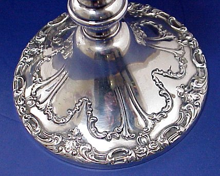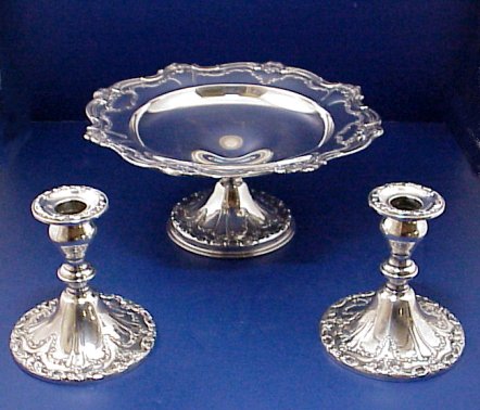 GORHAM STERLING CENTER BOWL AND MATCHING CANDLE HOLDERS: Matched set with ornate rims and bases, Pedestal bowl is 5 3/4''h, 10 1/4'' dia., #718. Candles are 5 1/4''h., #749. All pieces are weighted.