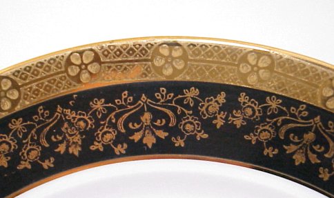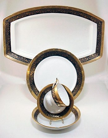 BLACK KNIGHT FINE CHINA SERVICE: Approx. 68 piece service for 12 to include 12 each of dinner plates, salad plates, bread plates, soup bowls, cups and saucers, 2 platters, covered vegetable, open vegetable, and teapot. Please note some pieces have worn gold edgings.