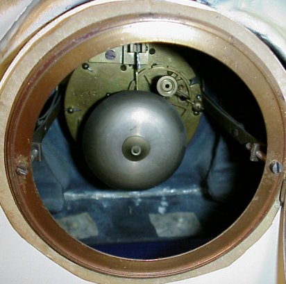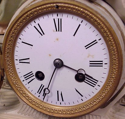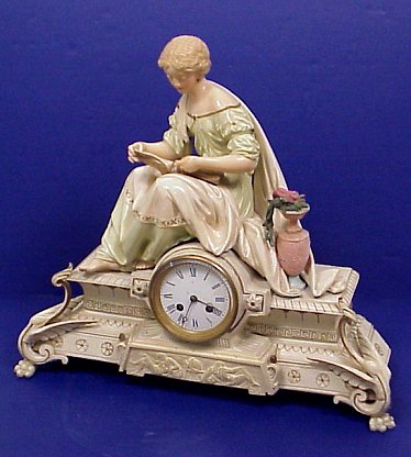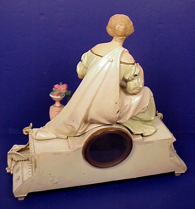 COLD PAINTED LATE VICTORIAN FIGURAL MANTLE CLOCK: 18 day gong strike clock with enameled dial, 4 1/8'' dia. Cold painted metal case surmounted by a draped woman with a book. Elaborate scrolled and winged feet. 17 1/2''h, x 19'' x 6''. Minor spots of paint loss.
