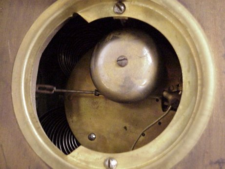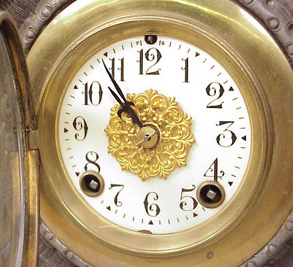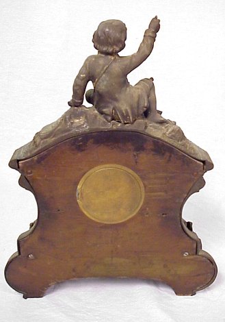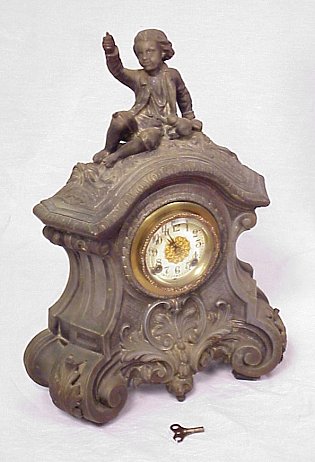 VICTORIAN SPELTER FIGURAL MANTLE CLOCK: Gong strike clock with enameled dial. Unfinished metal case surmounted by young boy. Key included. 17 1/2'' x 13 3/4'' x 5''.