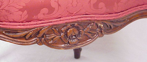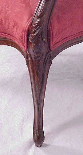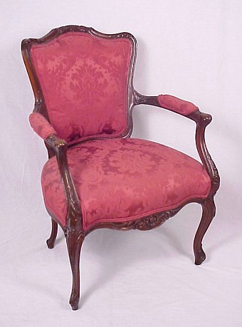 CARVED FRENCH OPEN ARM CHAIR: Nicely upholstered carved frame, serpentine front. 36'' h x 25'' w x 21'' d.