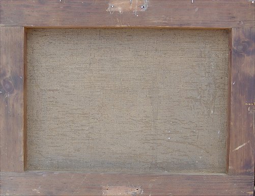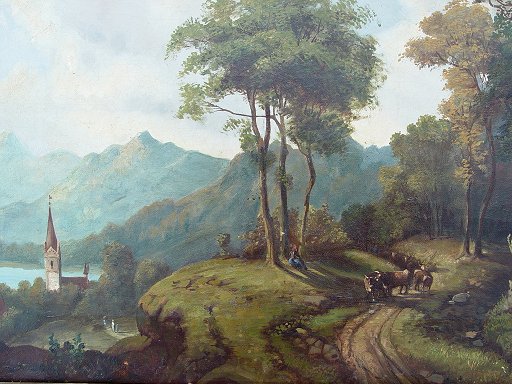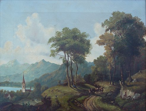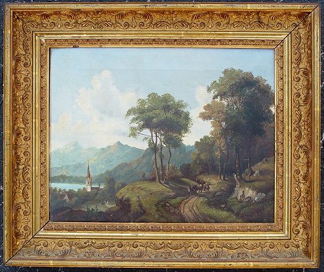 LATE 19TH TO EARLY 20TH CENTURY O/C LANDSCAPE: Hillside landscape overlooking a lakeside village, 12 3/4'' x 16 3/4'', no visible signature, good caliber, encased in an attractive embossed gilt molding with floral and foliate motif, wear to gilt.