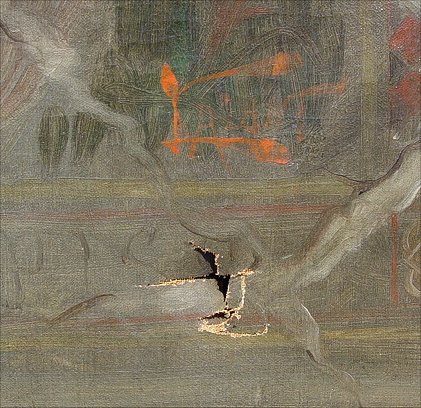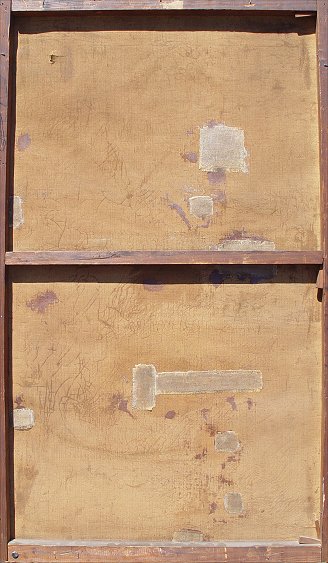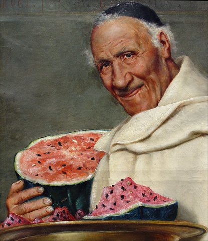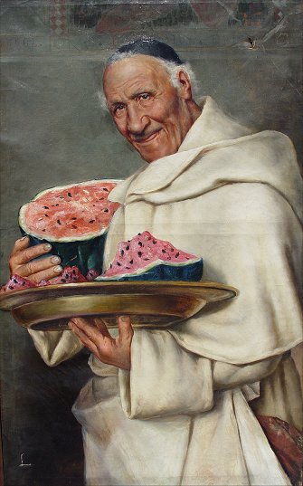 ITALIAN? 19TH C O/C OF SMILING PADRE CARRYING WATERMELON: 37 1/2'' x 22 3/4'', signed upper right illegibly *azani?. Condition - Numerous puncture repairs and puncture in upper right corner and lower left corner, craquelure throughout.