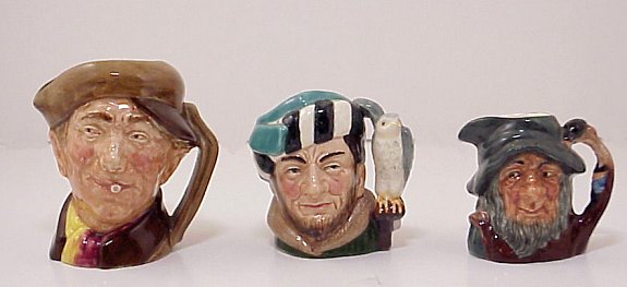 3 PIECE ROYAL DOULTON CHARACTER JUG LOT: Royal Doulton Small Character Jug ''Arry'' 3 1/4''h.; Royal Doulton Toby Mug Miniature ''The Falconeer''; Royal Doulton Toby Mug Miniature ''Rip Van Winkle''. Sold as a lot.