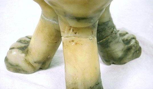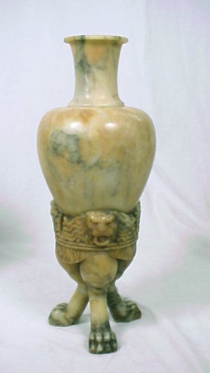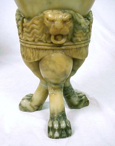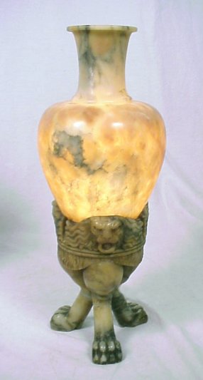 ART DECO CARVED ALABASTER LAMP: Carved lions and claw feet dominate the design of this vase shaped lamp. The narrow neck detaches for changing the electric bulb. Please note repair to each of the three legs. 21''h, 8'' dia. at the widest point.