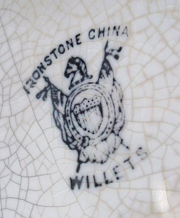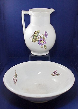 WILLETS IRONSTONE WASH BASIN AND PITCHER: White with morning glory flower and vine