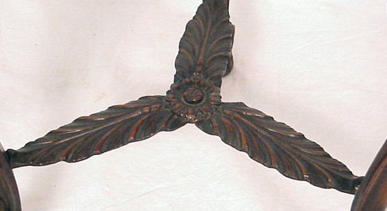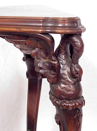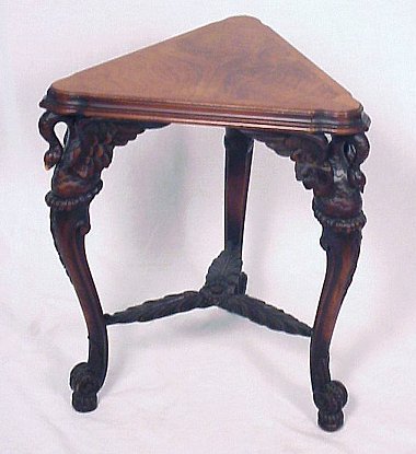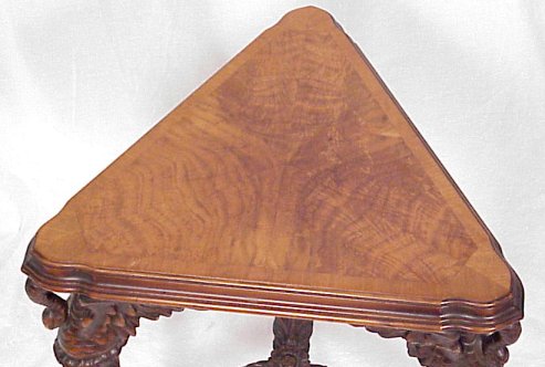 1920'S SWAN CARVED TABLE: Burled walnut traingular shaped table, the legs begin with full body swans, the stretchers are carved leaves center a flower. 22''h, 16'' dia. Restoration work, and one beak point is worn.