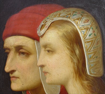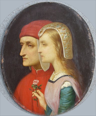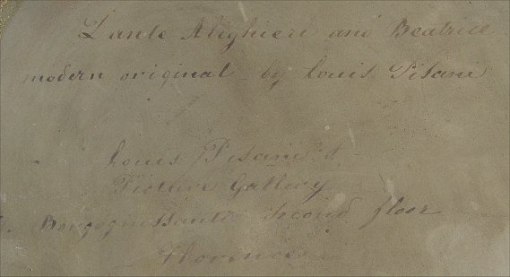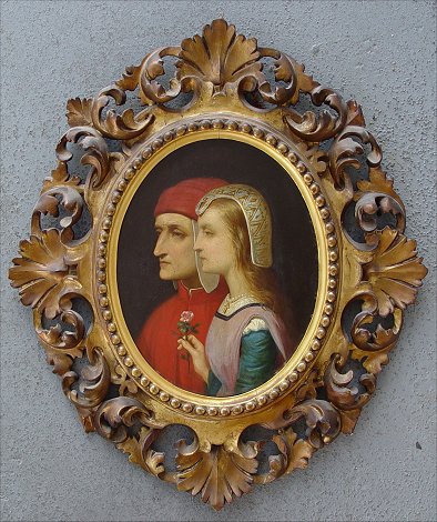 PISANI, Louis, (Italian, 19th/20th C): Dante Alighieri and Beatrice, O/B, 10 1/2'' x 8 1/2'', signed and titled verso with Pisani's picture gallery address in Florence. Encased in period gilded and pierce carved gesso molding with some damage to frame. Condition - Some minor craquelure, needs cleaning.