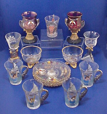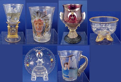 15 PC SHRINER'S SOUVENIR GLASS: Collection consists of 4 fish handle mugs, Atlantic City, 1904. A 1903 Indian face sword handle mug dated 1903. 2 cranberry flash goblets, St. Paul, 1908. Set of 4 handpainted plates, 6'' dia., Los Angeles 1908. A pair of small bowls, Ascalom Commendary, dated 1898.