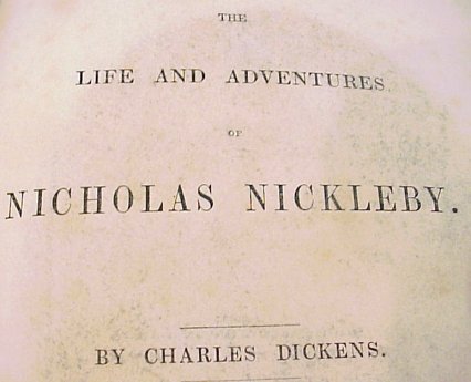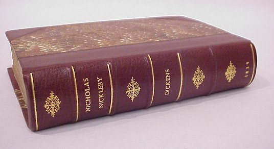 FIRST EDITION OF LIFE AND ADVENTURES OF NICHOLAS NICKLEBY: By Charles Dickens, illustrations by Phiz. Published by Chapman & Hall, London, 1839. 624 pages, with 39 plates. Leather bound with gold lettering. Darkening around the edges of many pages.